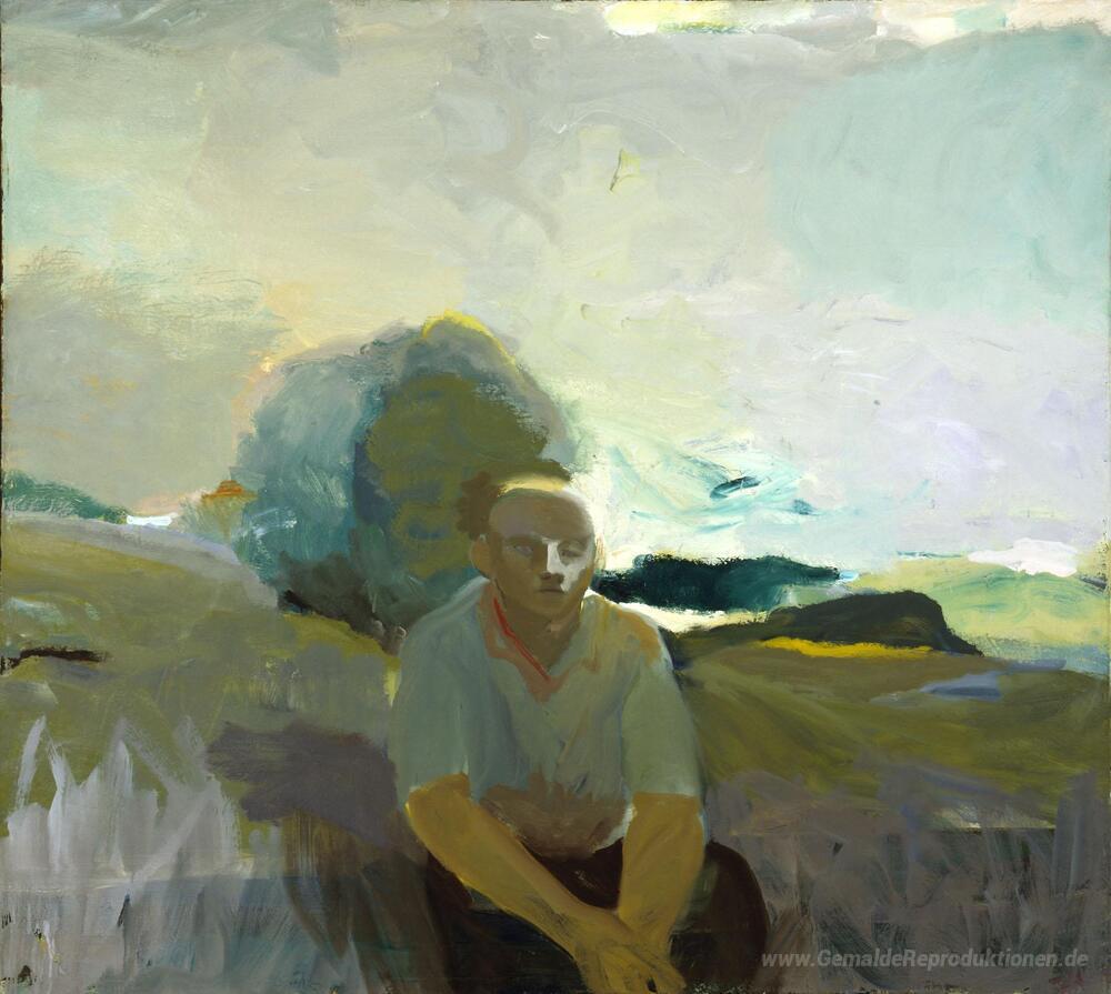 Wir bieten Ihnen eine handgefertigte Reproduktion auf Leinwand des berühmten Kunstwerks 'Abbildung in Landschaft' von Elmer Bischoff, aus dem Reproduktionsmuseum.