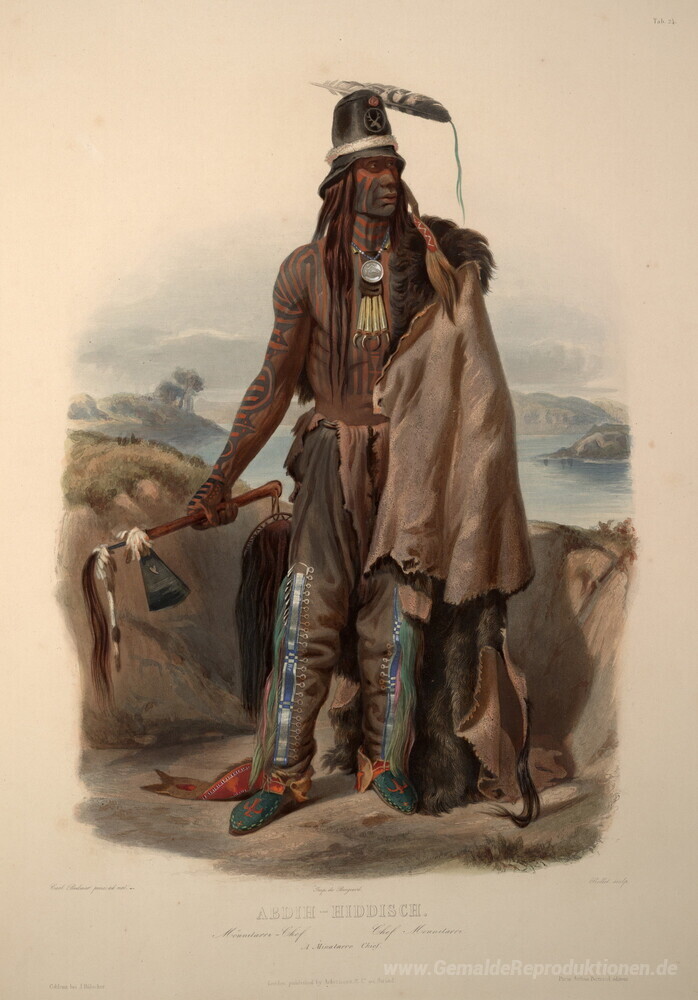 Wir bieten Ihnen eine handgefertigte Reproduktion auf Leinwand des berühmten Kunstwerks 'Abdih- Hiddisch. Ein Minatarre Chief, Platte 24 aus Band 1 der "' von Karl Bodmer, aus dem Reproduktionsmuseum.