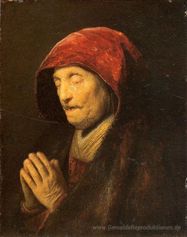 Wir bieten Ihnen eine handgefertigte Reproduktion auf Leinwand des berühmten Kunstwerks 'Alte Frau im Gebet' von Rembrandt, aus dem Reproduktionsmuseum.