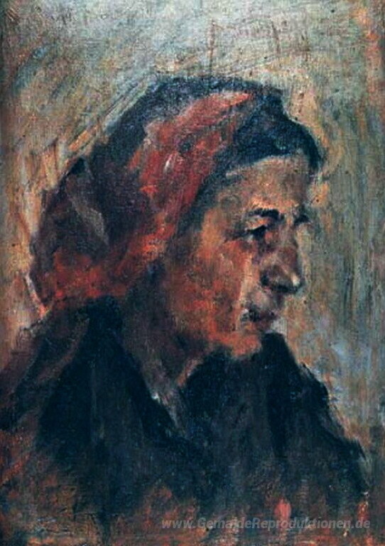 Wir bieten Ihnen eine handgefertigte Reproduktion auf Leinwand des berühmten Kunstwerks 'Alte Frau mit rotem Schal' von George Bouzianis, aus dem Reproduktionsmuseum.