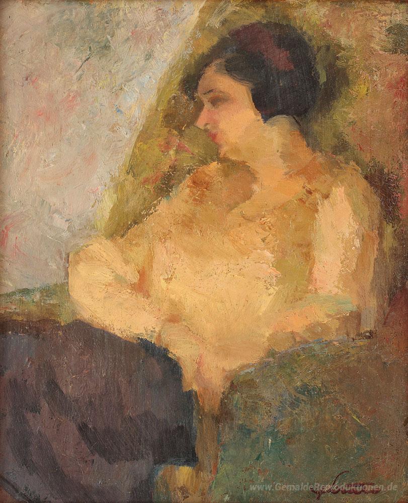 Wir bieten Ihnen eine handgefertigte Reproduktion auf Leinwand des berühmten Kunstwerks 'Aristocrat Portrait (Lila, Maler Niece)' von Francisc Sirato, aus dem Reproduktionsmuseum.