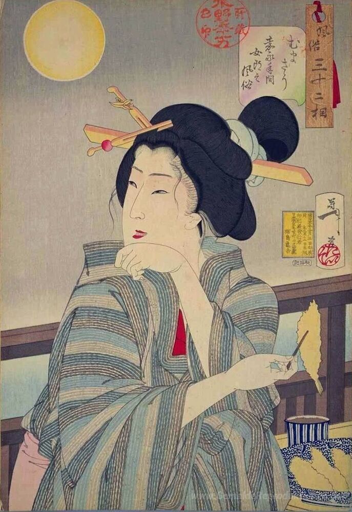 Die einzigartigen künstlerischen Techniken, die Yoshitoshi anwendet, von klassischer Farbgebung bis hin zu feinen Pinselstrichen, verleihen jedem seiner Gemälde eine unverwechselbare Tiefe. Dieses klassische Ölgemälde ist nicht nur ein dekoratives Element, sondern trägt auch zur Atmosphäre Ihres Raums bei, indem es Eleganz und Stil vermittelt. Verleihen Sie Ihrem Zuhause mit einem Kunstwerk von Tsukioka Yoshitoshi einen Hauch von Inspiration und Kultur.