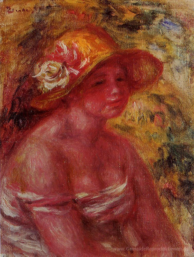 Wir bieten Ihnen eine handgefertigte Reproduktion auf Leinwand des berühmten Kunstwerks 'Büste eines jungen Mädchens, das einen Strohhut' von Pierre-Auguste Renoir, aus dem Reproduktionsmuseum.