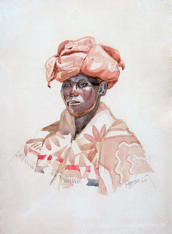 Wir bieten Ihnen eine handgefertigte Reproduktion auf Leinwand des berühmten Kunstwerks 'Basoth Frau mit Kopfschmuck' von George Pemba, aus dem Reproduktionsmuseum.