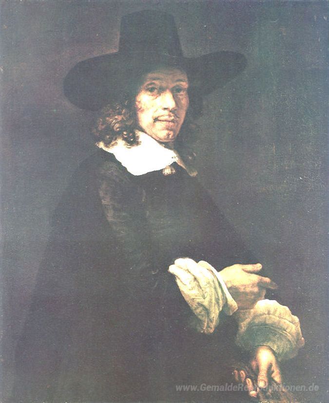Wir bieten Ihnen eine handgefertigte Reproduktion auf Leinwand des berühmten Kunstwerks 'Bildnis eines Mannes mit einem großen Hut und Handschuhe' von Rembrandt, aus dem Reproduktionsmuseum.