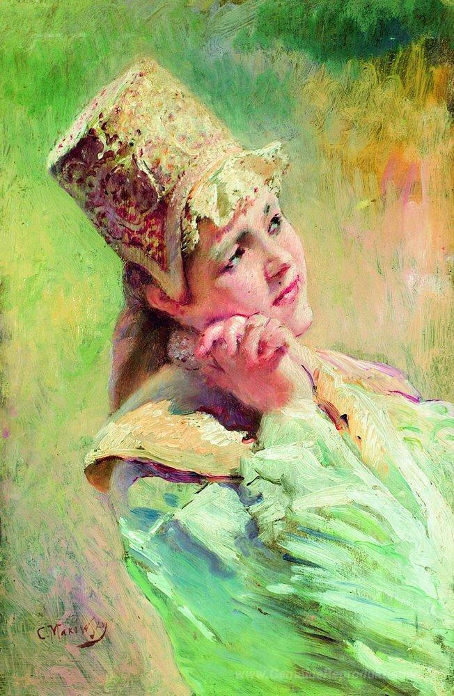 Wir bieten Ihnen eine handgefertigte Reproduktion auf Leinwand des berühmten Kunstwerks 'Boyaryshnya' von Konstantin Makovsky, aus dem Reproduktionsmuseum.