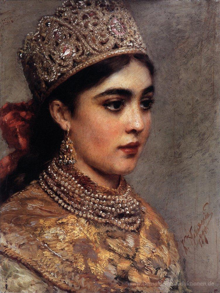 Wir bieten Ihnen eine handgefertigte Reproduktion auf Leinwand des berühmten Kunstwerks 'Boyaryshnya' von Konstantin Makovsky, aus dem Reproduktionsmuseum.