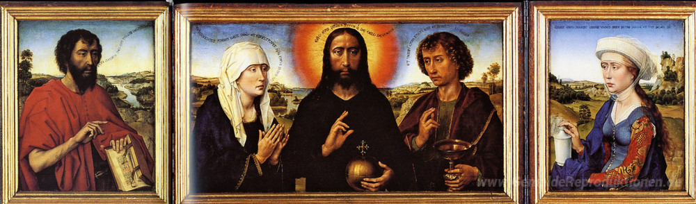 Wir bieten Ihnen eine handgefertigte Reproduktion auf Leinwand des berühmten Kunstwerks 'Braque Familien-Triptychon' von Rogier van der Weyden, aus dem Reproduktionsmuseum.