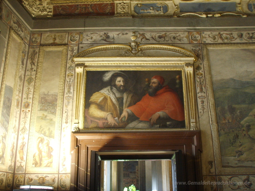 Wir bieten Ihnen eine handgefertigte Reproduktion auf Leinwand des berühmten Kunstwerks 'Clemenet VII und Franz I. von Frankreich' von Giorgio Vasari, aus dem Reproduktionsmuseum.