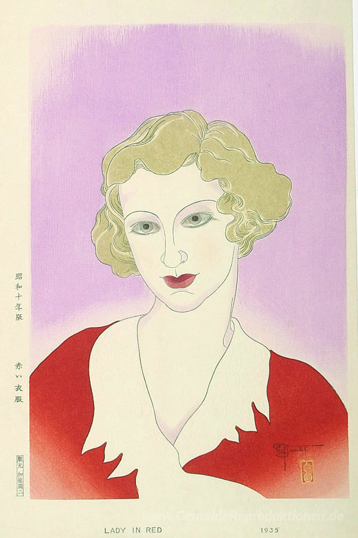 Wir bieten Ihnen eine handgefertigte Reproduktion auf Leinwand des berühmten Kunstwerks 'Dame in rot' von Paul Jacoulet, aus dem Reproduktionsmuseum.