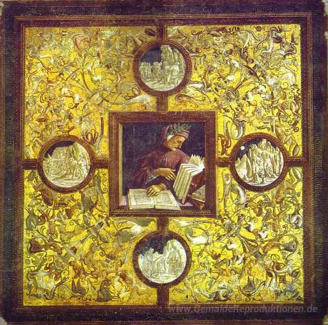 Wir bieten Ihnen eine handgefertigte Reproduktion auf Leinwand des berühmten Kunstwerks 'Dante mit Szenen aus der Göttlichen Komödie' von Luca Signorelli, aus dem Reproduktionsmuseum.
