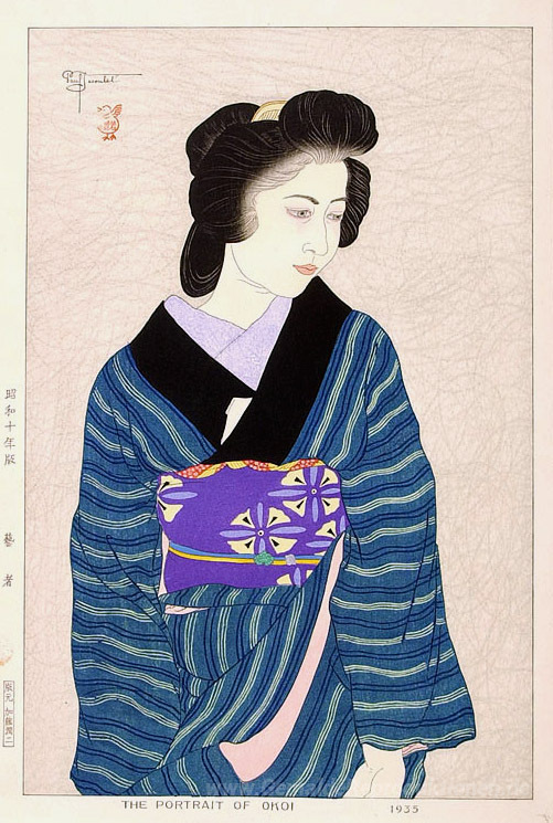 Wir bieten Ihnen eine handgefertigte Reproduktion auf Leinwand des berühmten Kunstwerks 'Das Porträt von Okoi' von Paul Jacoulet, aus dem Reproduktionsmuseum.