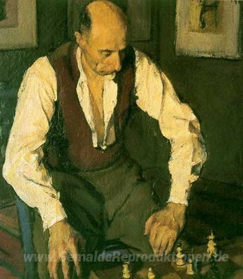 Wir bieten Ihnen eine handgefertigte Reproduktion auf Leinwand des berühmten Kunstwerks 'Der Schachspieler' von Corneliu Baba, aus dem Reproduktionsmuseum.