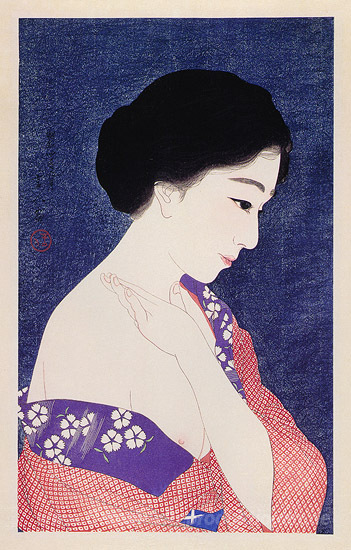 Wir bieten Ihnen eine handgefertigte Reproduktion auf Leinwand des berühmten Kunstwerks 'Die Anwendung von Pulver' von Torii Kotondo, aus dem Reproduktionsmuseum.