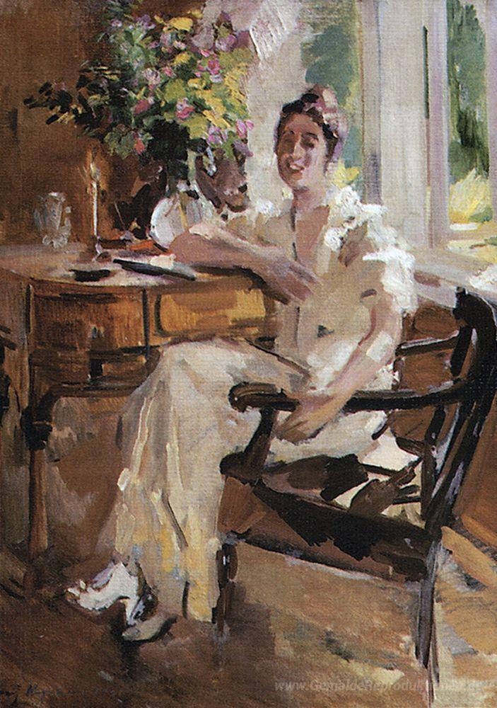 Wir bieten Ihnen eine handgefertigte Reproduktion auf Leinwand des berühmten Kunstwerks 'Die Dame auf dem Stuhl' von Konstantin Korovin, aus dem Reproduktionsmuseum.