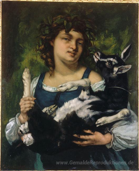 Wir bieten Ihnen eine handgefertigte Reproduktion auf Leinwand des berühmten Kunstwerks 'Die Dorf-Mädchen mit einem Goatling' von Gustave Courbet, aus dem Reproduktionsmuseum.