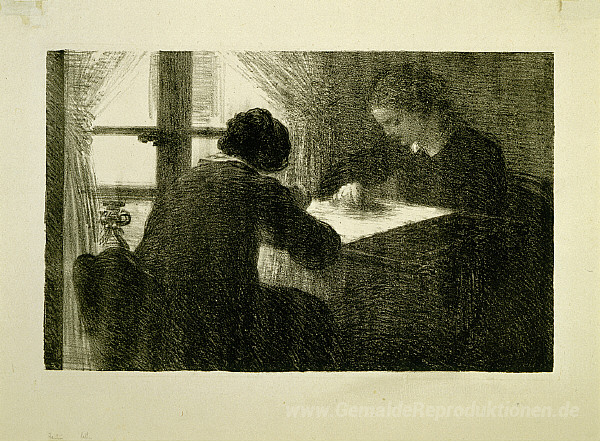 Wir bieten Ihnen eine handgefertigte Reproduktion auf Leinwand des berühmten Kunstwerks 'Die Embroiderers' von Henri Fantin-Latour, aus dem Reproduktionsmuseum.