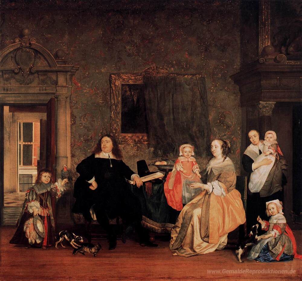 Wir bieten Ihnen eine handgefertigte Reproduktion auf Leinwand des berühmten Kunstwerks 'Die Familie von Jan Jacobsz Hinlopen' von Gabriel Metsu, aus dem Reproduktionsmuseum.