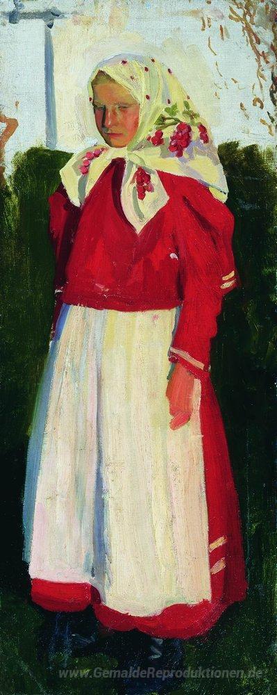 Wir bieten Ihnen eine handgefertigte Reproduktion auf Leinwand des berühmten Kunstwerks 'Dunya in rot' von Boris Kustodiev, aus dem Reproduktionsmuseum.