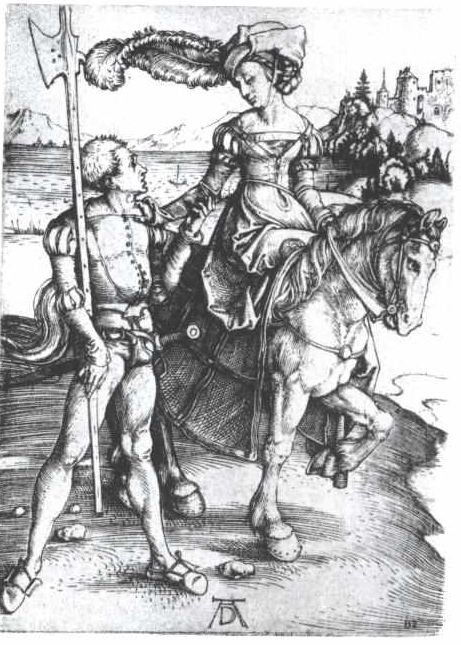 Wir bieten Ihnen eine handgefertigte Reproduktion auf Leinwand des berühmten Kunstwerks 'Edle Frau zu Pferde und Lansquenet' von Albrecht Durer, aus dem Reproduktionsmuseum.