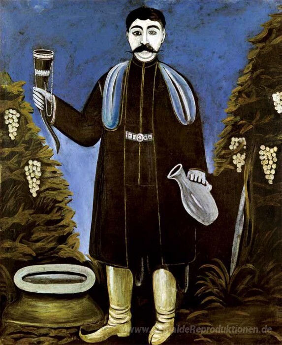 Wir bieten Ihnen eine handgefertigte Reproduktion auf Leinwand des berühmten Kunstwerks 'Edle mit einem Horn für Wein trinken' von Niko Pirosmani, aus dem Reproduktionsmuseum.