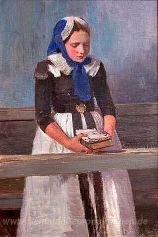 Wir bieten Ihnen eine handgefertigte Reproduktion auf Leinwand des berühmten Kunstwerks 'Ein junges Mädchen,' von Hans am Ende, aus dem Reproduktionsmuseum.