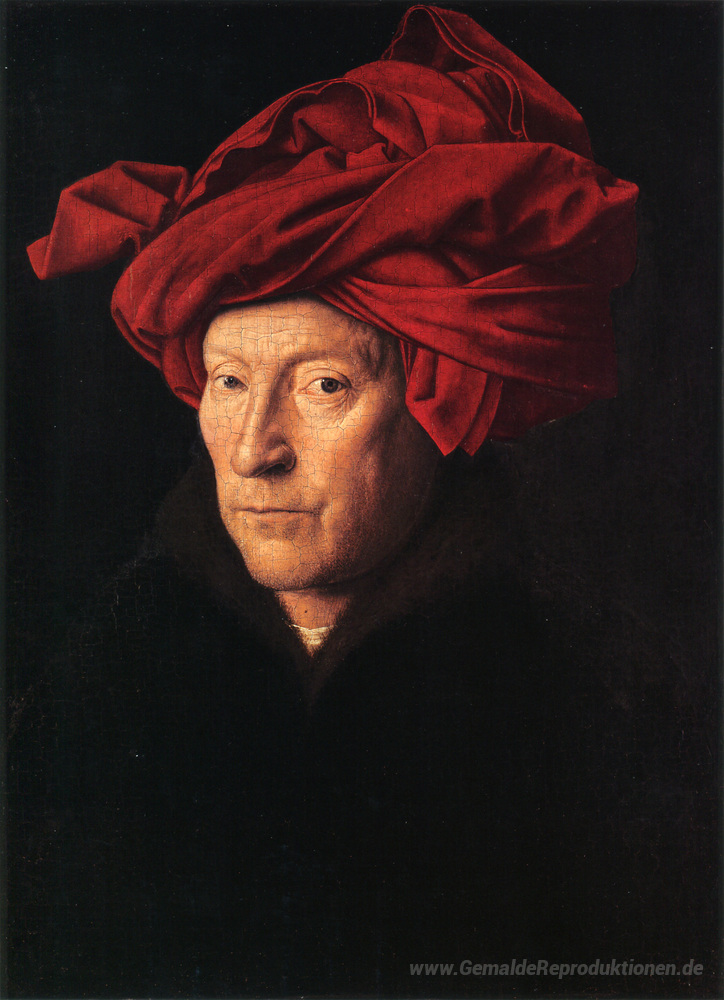 Wir bieten Ihnen eine handgefertigte Reproduktion auf Leinwand des berühmten Kunstwerks 'Ein Mann in einem Turban' von Jan van Eyck, aus dem Reproduktionsmuseum.