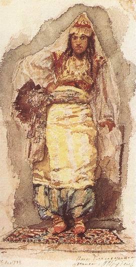 Wir bieten Ihnen eine handgefertigte Reproduktion auf Leinwand des berühmten Kunstwerks 'Ein Modell mit östlichen Kleid' von Mikhail Vrubel, aus dem Reproduktionsmuseum.