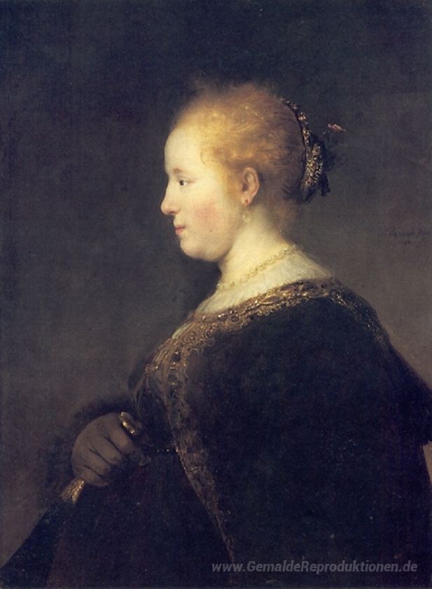 Wir bieten Ihnen eine handgefertigte Reproduktion auf Leinwand des berühmten Kunstwerks 'Eine junge Frau im Profil mit einem Fan' von Rembrandt, aus dem Reproduktionsmuseum.