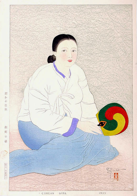 Wir bieten Ihnen eine handgefertigte Reproduktion auf Leinwand des berühmten Kunstwerks 'Eine koreanische Mädchen' von Paul Jacoulet, aus dem Reproduktionsmuseum.