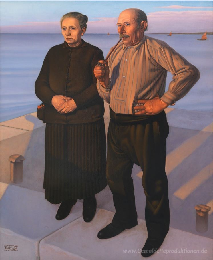 Wir bieten Ihnen eine handgefertigte Reproduktion auf Leinwand des berühmten Kunstwerks 'Fishermans' von Cagnaccio di San Pietro, aus dem Reproduktionsmuseum.
