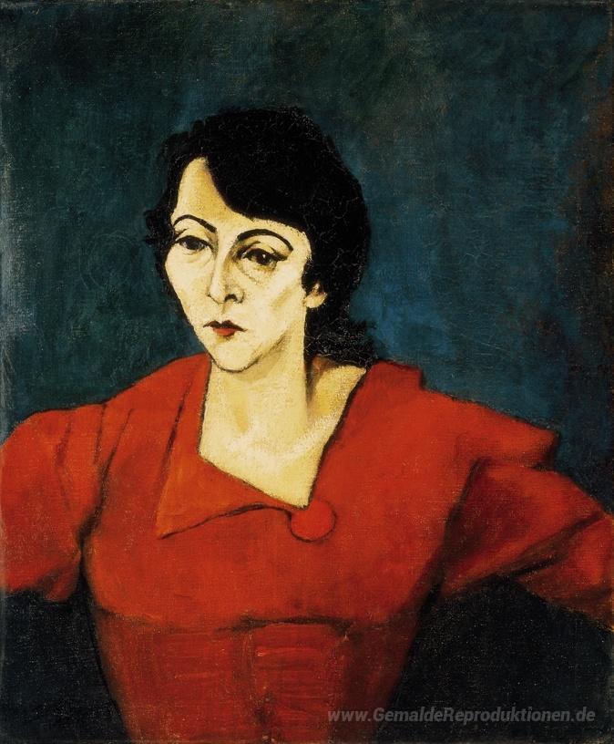 Wir bieten Ihnen eine handgefertigte Reproduktion auf Leinwand des berühmten Kunstwerks 'Frau im Rot mit grünem Hintergrund' von Lajos Tihanyi, aus dem Reproduktionsmuseum.