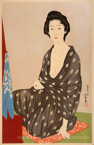 Wir bieten Ihnen eine handgefertigte Reproduktion auf Leinwand des berühmten Kunstwerks 'Frau im Sommer-Kleid' von Goyo Hashiguchi, aus dem Reproduktionsmuseum.