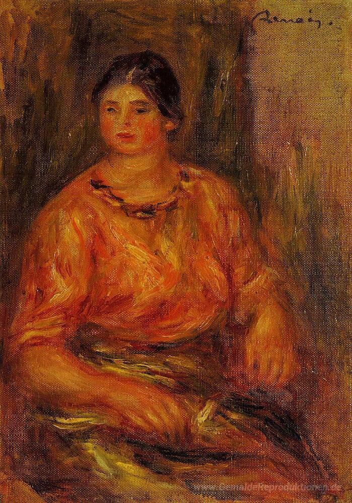 Wir bieten Ihnen eine handgefertigte Reproduktion auf Leinwand des berühmten Kunstwerks 'Frau in einem roten Bluse' von Pierre-Auguste Renoir, aus dem Reproduktionsmuseum.