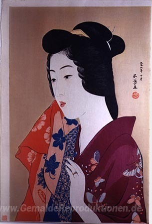 Wir bieten Ihnen eine handgefertigte Reproduktion auf Leinwand des berühmten Kunstwerks 'Frau mit einem Handtuch' von Goyo Hashiguchi, aus dem Reproduktionsmuseum.
