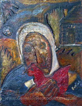 Wir bieten Ihnen eine handgefertigte Reproduktion auf Leinwand des berühmten Kunstwerks 'Frau mit einem Huhn' von David Burliuk, aus dem Reproduktionsmuseum.