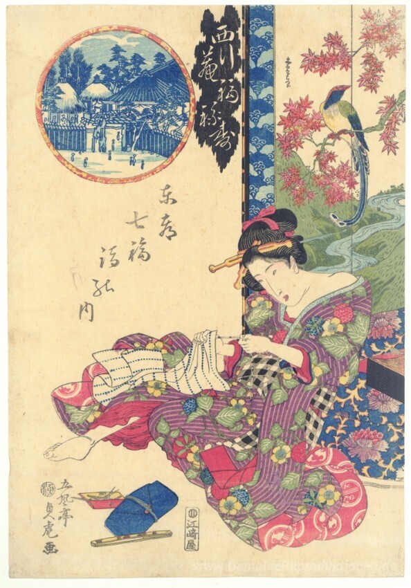 Wir bieten Ihnen eine handgefertigte Reproduktion auf Leinwand des berühmten Kunstwerks 'Frau sitzt vor einem Bildschirm mit dem Titel Fukurokuju' von Utagawa Sadatora, aus dem Reproduktionsmuseum.