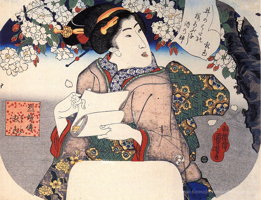 Wir bieten Ihnen eine handgefertigte Reproduktion auf Leinwand des berühmten Kunstwerks 'Frau unter einem Kirschbaum' von Utagawa Kuniyoshi, aus dem Reproduktionsmuseum.