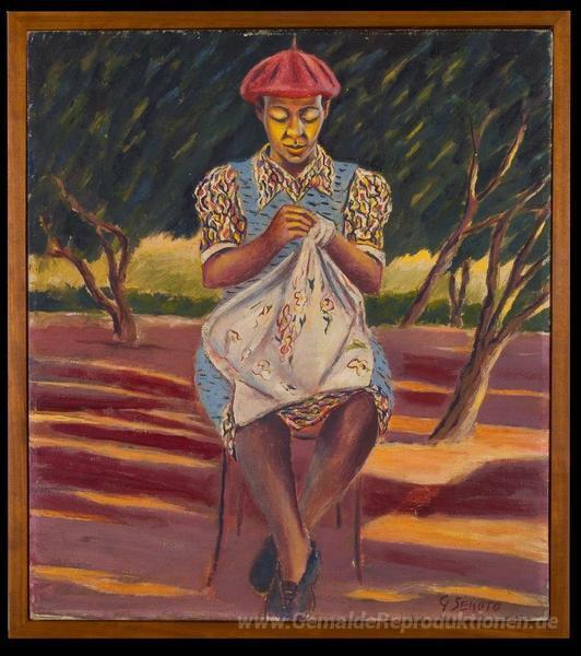 Willkommen in der faszinierenden Welt der Ölgemälde, wo Kunst und Emotion in jedem Pinselstrich verschmelzen. Eines unserer herausragenden Werke ist Frauen-Nähen, geschaffen von dem visionären Künstler Gerard Sekoto. Sekoto, ein Pionier der südafrikanischen Malerei, ist bekannt für seinen einzigartigen Stil, der eindrucksvolle Szenen des Alltagslebens mit leuchtenden Farben und gefühlvollen Kompositionen vereint. Seine Kunst zeugt von einer tiefen Verbundenheit zu den Traditionen und dem kulturellen Erbe seiner Heimat.