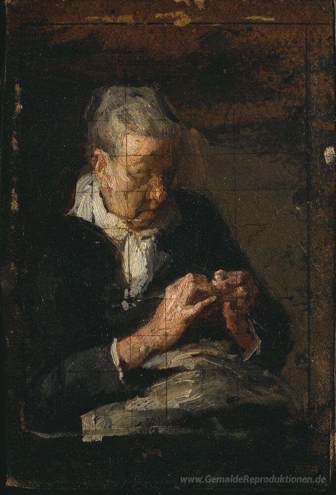 Wir bieten Ihnen eine handgefertigte Reproduktion auf Leinwand des berühmten Kunstwerks 'Frauen-Stricken' von Thomas Eakins, aus dem Reproduktionsmuseum.