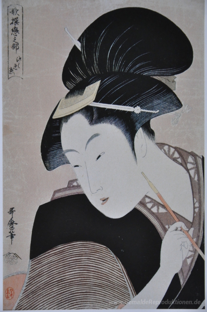 Die technischen Fertigkeiten von Kitagawa Utamaro zeigen sich in der detailreichen Ausführung seiner Figuren und der geschickten Verwendung von Licht und Schatten. Ein Gemälde wie „Geheime Liebe“ ist nicht nur ein visuelles Erlebnis, sondern verleiht jedem Raum eine besondere Note. Die emotionale Tiefe und die anmutige Präsenz des Kunstwerks schaffen eine einladende Atmosphäre, die Ihren Wohn- oder Arbeitsbereich in eine Oase der Inspiration verwandelt.