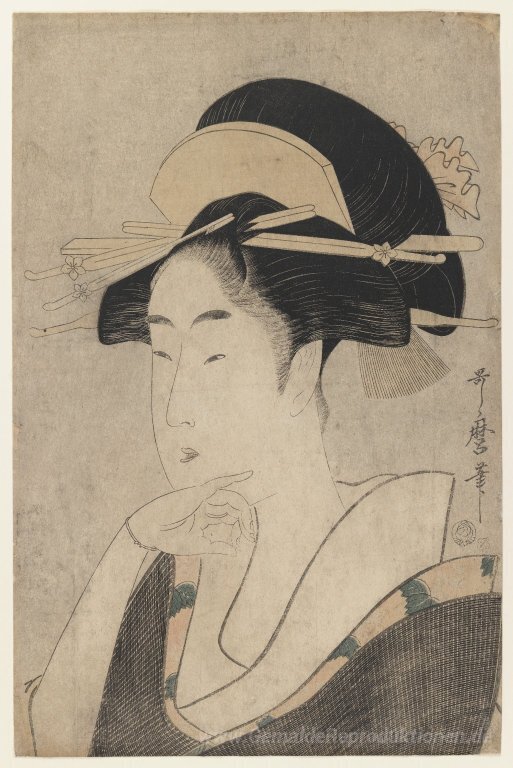 Willkommen in unserer exquisiten Sammlung von Ölgemälden, wo Kunst und Emotionen zusammenkommen. Hier finden Sie das fesselnde Werk Großer Kopf und Bust Portrait of Beauty, geschaffen von dem Meister des Ukiyo-e, Kitagawa Utamaro. Utamaro, bekannt für seine feinfühligen Porträts und einzigartige Farbkompositionen, transportiert den Betrachter in eine Welt der Anmut und Schönheit. Seine Technik, die Details von Gesichtszügen und Texturen meisterhaft darzustellen, ermöglicht es, die Essenz der dargestellten Schönheit einzufangen.