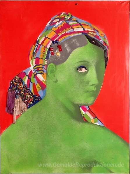 Wir bieten Ihnen eine handgefertigte Reproduktion auf Leinwand des berühmten Kunstwerks 'Hergestellt in Japan, La Grande Odalisque' von Martial Raysse, aus dem Reproduktionsmuseum.