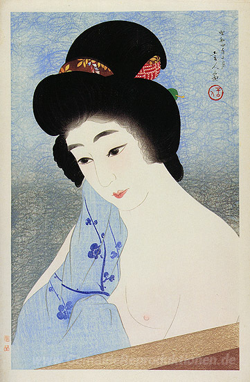 Wir bieten Ihnen eine handgefertigte Reproduktion auf Leinwand des berühmten Kunstwerks 'Im Bad' von Torii Kotondo, aus dem Reproduktionsmuseum.