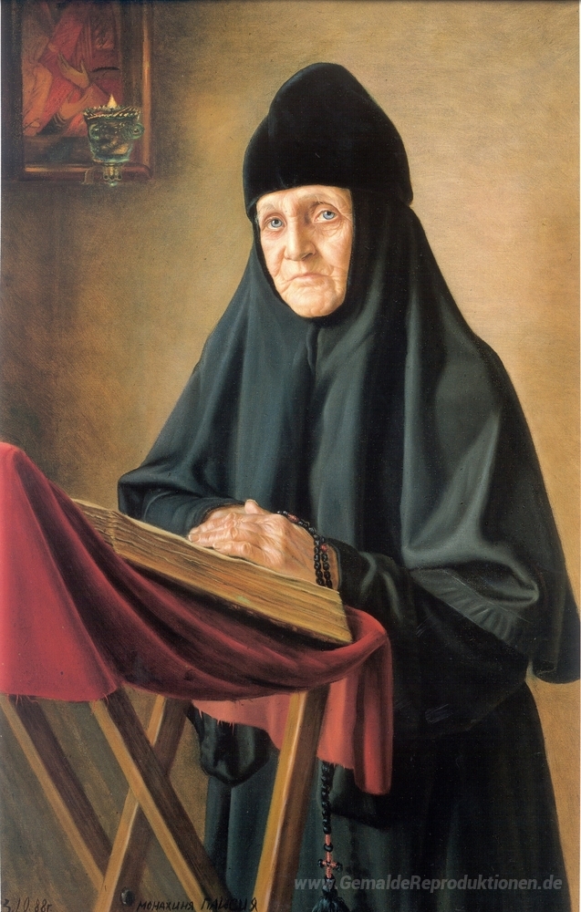 Wir bieten Ihnen eine handgefertigte Reproduktion auf Leinwand des berühmten Kunstwerks 'In der Zelle (Mutter Paisija). Puhtitsky Kloster' von Alexander Shilov, aus dem Reproduktionsmuseum.