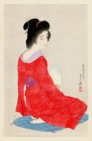 Wir bieten Ihnen eine handgefertigte Reproduktion auf Leinwand des berühmten Kunstwerks 'In einer langen Unterwäschen (Variante)' von Torii Kotondo, aus dem Reproduktionsmuseum.