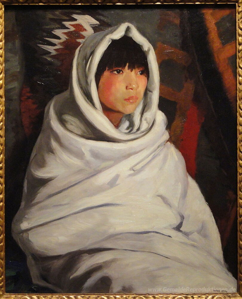 Wir bieten Ihnen eine handgefertigte Reproduktion auf Leinwand des berühmten Kunstwerks 'Indisches Mädchen in der weißen Decke' von Robert Henri, aus dem Reproduktionsmuseum.