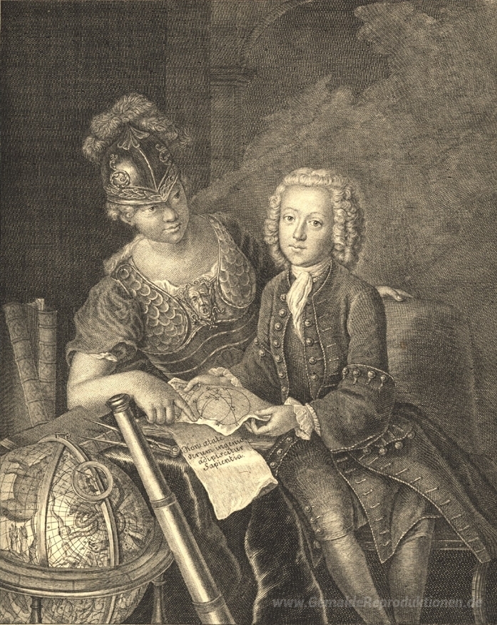Wir bieten Ihnen eine handgefertigte Reproduktion auf Leinwand des berühmten Kunstwerks 'Jean Philippe Baratier von Minerva vorgestellt, deutsche Gelehrt' von Antoine Pesne, aus dem Reproduktionsmuseum.