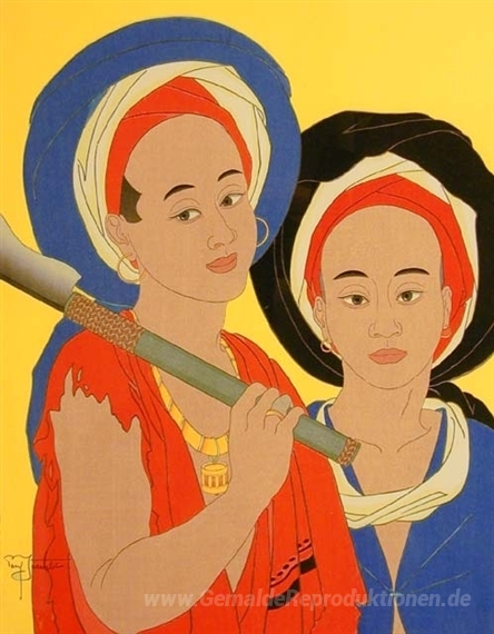 Wir bieten Ihnen eine handgefertigte Reproduktion auf Leinwand des berühmten Kunstwerks 'Jeunes Chasseurs de la Jungle. Nord-Celebes' von Paul Jacoulet, aus dem Reproduktionsmuseum.