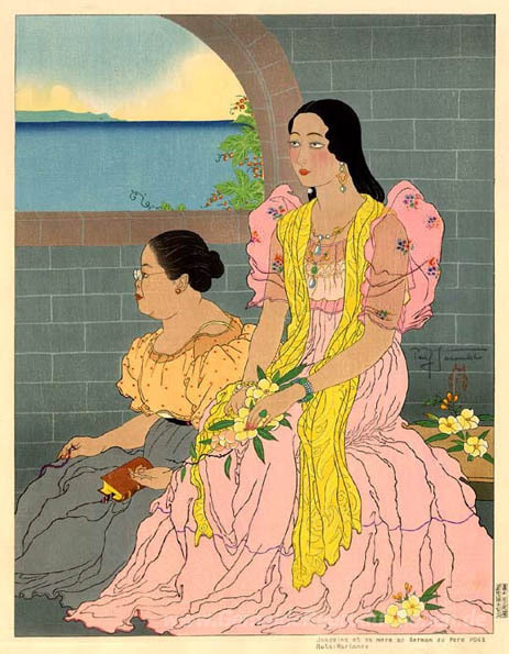 Wir bieten Ihnen eine handgefertigte Reproduktion auf Leinwand des berühmten Kunstwerks 'Joaquina Et Sa Mere Au Sermon Du Pere Pons. Rota, Marianen' von Paul Jacoulet, aus dem Reproduktionsmuseum.